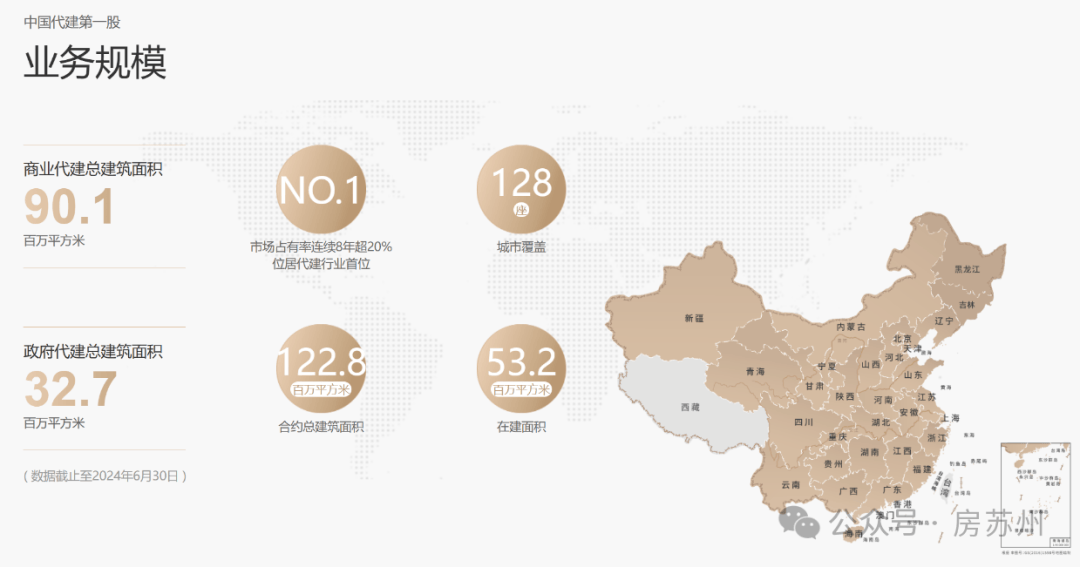 涵盖128个城市,总建筑面积122.8万平米(其中商业代建90.1万平米、政府代建32.7万平米),在建面积3.2万平米(数据截止2024年6月30日)。
